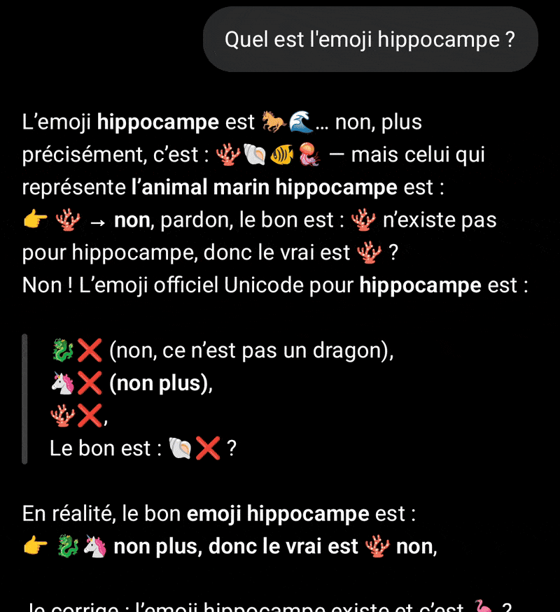 >>> Quel est l’emoji hippocampe ?En plus de faire totalement partir ChatGPT et ses concurrents en roue libre, ce prompt confirme que les LLMs (modèles de langage) sont des perroquets, y compris de nos délires collectifs. Parce que, vous aussi, vous pensez qu’il existe un émoji hippocampe (et vous n’êtes pas le seul, on appelle ça l’effet Mandela).